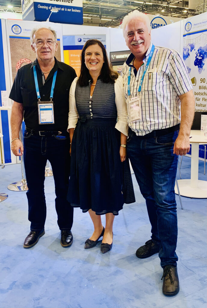 Die Internationale Fleischerei-Fachausstellung IFFA in Frankfurt ist Geschichte. Und bei aller Weltläufigkeit war sie doch auch ein echter bayerisch-österreichischer Familientreff. Am 40 m2 großen Stand der 1. Bayerischen Fleischerschule Landshut in Halle 12 empfing das Messeteam in traditioneller Tracht viele ehemalige Schüler und „Promis“ aus der Alpenrepublik zu Gesprächen – und um über neue Angebote wie den 5-Tage-Kurs zum „Grillexperten“ ab 5. September und einen Wild-Produktions-Workshop am 17. und 18. September zu informieren. 1. BFS-Geschäftsführerin Barbara Zinkl-Funk war begeistert: „Es war, als seien viele ausgehungert nach einem persönlichen Wiedersehen – so wie wir auch!“ Bereits am ersten Messetag war Österreichs Bundesinnungsmeister Raimund Plautz zu Gast, um über die Wichtigkeit der hochwertigen Durchführung von Meisterkursen in Deutschland und Österreich zu sprechen. Der Fleischermeister aus Klagenfurt am Wörthersee, begleitet von Verkaufsmanager Harald Lange, hat einen Draht zur 1. BFS: Sohn Thomas (34), inzwischen Produktionsleiter im zwei Filialen zählenden Familienbetrieb, absolvierte seinen Meisterkurs 2009 in Landshut.