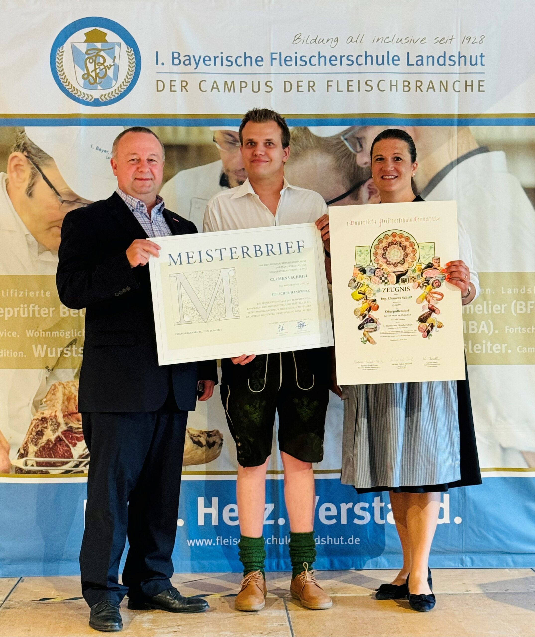 Alle Teilnehmer:innen büffelten 12 Wochen im 454. Meisterkurs der 1. Bayerischen Fleischerschule Landshut (1. BFS). Unter ihnen der Lackenbacher Clemens Schrifl (32). Schrifl schloss zuerst eine Ausbildung zum Lebensmitteltechnologen mit der Fachrichtung Fleischwirtschaft an der HTLLT Hollabrunn bevor er sich für die Weiterbildung zum Meister in Landshut entschied.