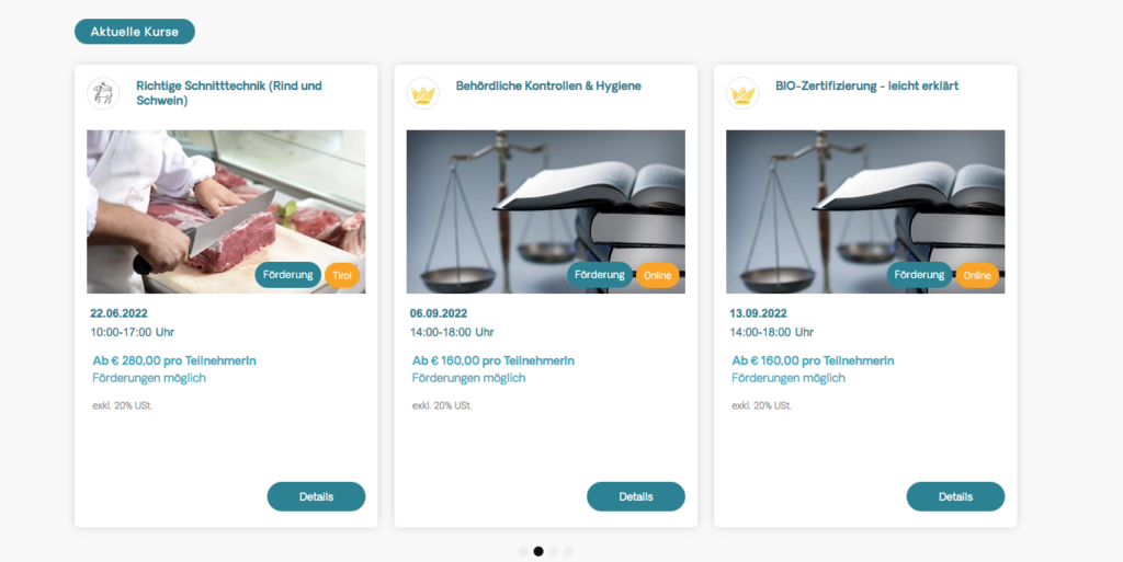 Das Herzstück bildet die Online-Kursbuchung. Unser gesamtes Kursangebot der Lebensmittelakademie ist jetzt online verfügbar und natürlich buchbar. Die gefilterte Suchfunktion macht es möglich Kurse eingeschränkt zu suchen: Beispielsweise kann auf der homepage speziell nach Kursen für Fleischer:innengesucht beziehungsweise gefiltert werden. Die Kurse lassen sich aber auch nach Bundesländern oder Vortragenden sortieren. Dadurch wurde die Möglichkeit geschaffen, dass alle Betriebe die für sie relevanten Kurse ganz schnell finden und einfach online buchen können. Die Einmalige Online-Registrierung ermöglicht es, dass Sie automatisch die möglichen Förderungen für Ihr Bundesland angezeigt bekommen. Abgesehen von der Kursbuchung und dem Kursangebot werden auf der neuen Homepage auch aktuelle Informationen rund um Veranstaltungen und andere News gestellt. Und Sie können auch direkt mit uns in Kontakt treten und uns bei Anliegen aller Art kontaktieren.