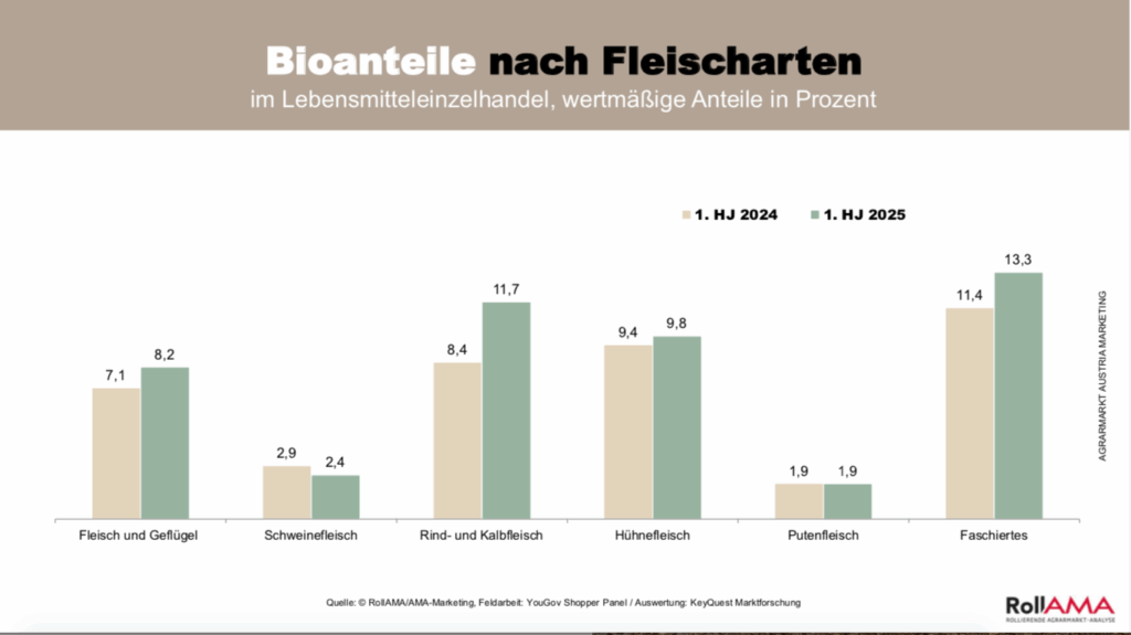 Bio ist vor allem in jenen Produktgruppen präsent, die täglich am Tisch stehen. Bei Frischmilch liegt der Bio-Anteil bereits bei 35 Prozent im Wert, Naturjoghurt erreicht über 23 Prozent. Wurzelgemüse überschreitet mit mehr als 40 Prozent sogar die Hälfte des Marktes, Eier kommen auf 18 Prozent. Auch im Fleischbereich ist Bewegung erkennbar: Während Rind- und Kalbfleisch von 8 auf 12 Prozent Bio-Anteil wachsen konnten, bleibt Schweinefleisch mit 2 bis 3 Prozent noch deutlich zurück.