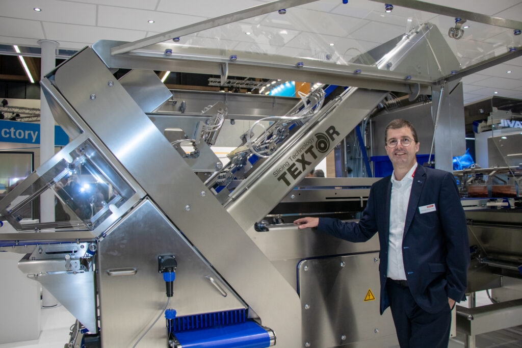 Gerhard Pockenauer-Gramiller am Stand von Weber Maschinenbau: „Im Bereich Schneiden und Verpacken zeigte Weber Schneide- und Verpackungskomplettlinien, die sowohl mechanisch als auch steuerungstechnisch zusammenwachsen. Dadurch ergeben sich Vorteile in der intuitiven Bedienbarkeit und Linienauswertung. Große Fortschritte gab es bei den digitalen Produkten und Cloud- lösungen, wo Linien visualisiert und überwacht werden können.“ © Andrea Sturm