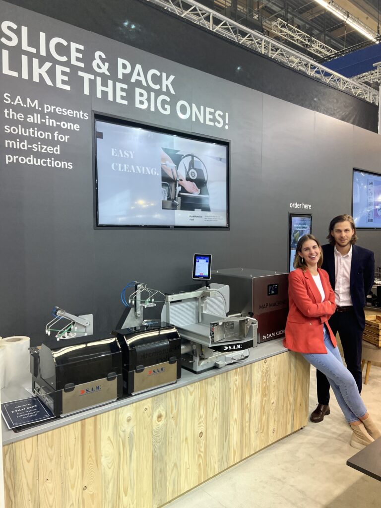 Auch Valentina und Constantin Kuchler vom Kärntner Unternehmen S.A.M. Kuchler Electronics GmbH stellten ihre hochqualitativen Aufschnitt- und Verpackungsmaschinen in Frankfurt vor. Ihr Fokus war: automatisches Schneiden und Verpacken auf kleinstem Raum für flexible Produktionsstätten im Mittelstand, Handwerksbetrieb und Thekenbereich.