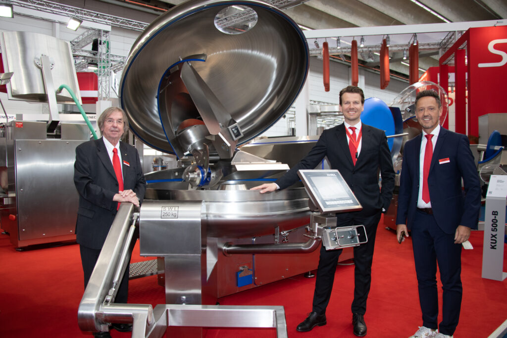 Dank hoher Schnittgeschwindigkeit und hochtechnischem Design der Messerhaube sorgen Laska Kutter für feinstes Brät bei kürzesten Chargenzeiten. Jahrzehntelange Erfahrung mit über 2.000 Maschinen garantieren einen hocheffizienten Betrieb ohne Unterbrechungen. DI Maximilian Laska, Geschäftsführer der Maschinenfabrik Laska in Traun (Mitte) und Wilfried Laska (links) präsentieren den Kutter. © Andrea Sturm