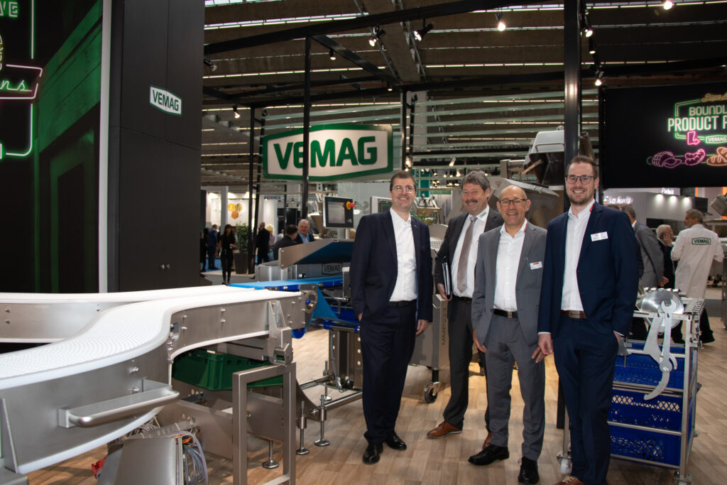 Vemag Maschinenbau präsentierte speziell für handwerkliche Unter- nehmen zahlreiche Neuheiten, die sich durch eine hohe Alltagstauglichkeit, leichte Handhabung und einfache Reinigung auszeichnen. Unter anderem eine Weltneuheit: Das Vorsatzgerät Füllwolf985 für die Füllmaschine HP1 zum gleichzeitigen Wolfen und Füllen von Massen war ein absolutes Messehighlight. Im Bild: Gerhard Pockenauer-Gramiller (l.) und sein Team im Talk am Vemag-Stand. (© Andrea Sturm)