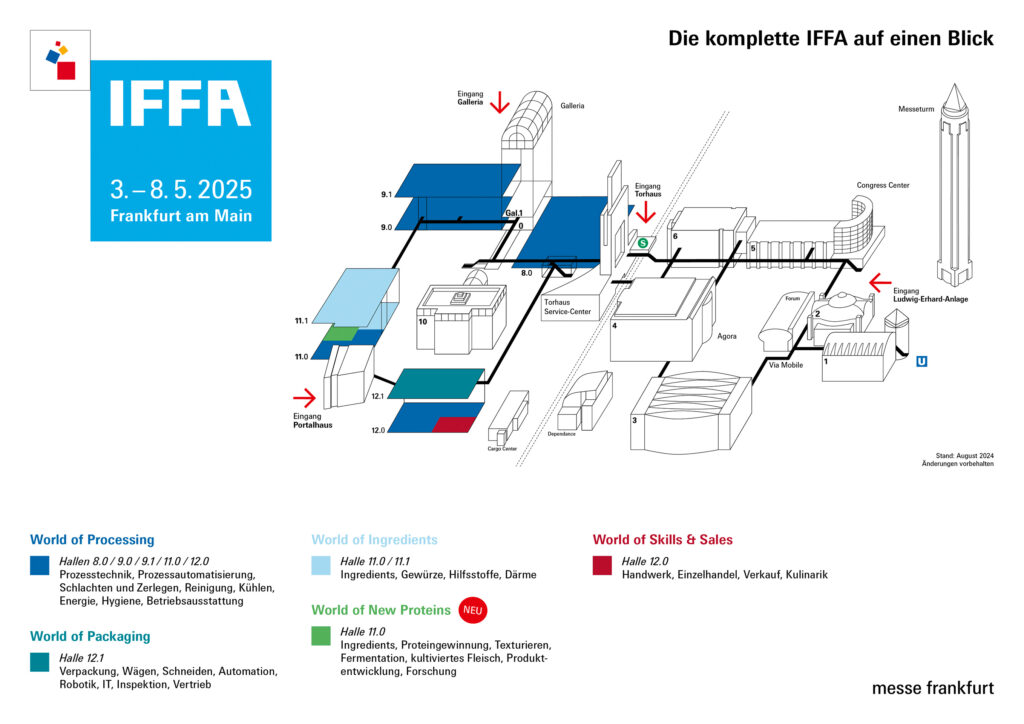 Anfang Mai 2025 wird die IFFA, die Internationale Leitmesse Technology for Meat and Alternative Proteins, zum Fixpunkt der globalen Fleischund Proteinwirtschaft. Unter dem Motto „Rethinking Meat and Proteins“ zeigt die Branche ihre Innovationen. Ein einzigartiger Fokus auf dem Gesamtprozess vom Rohstoff bis zum fertigen Produkt – das ist das Alleinstellungsmerkmal der IFFA. Hier werden alle Prozessschritte abgebildet: von der Herstellung, Verarbeitung und Verpackung von Fleisch und alternativen Proteinen über innovative Zutaten bis zu den Produkttrends am Point of Sale.