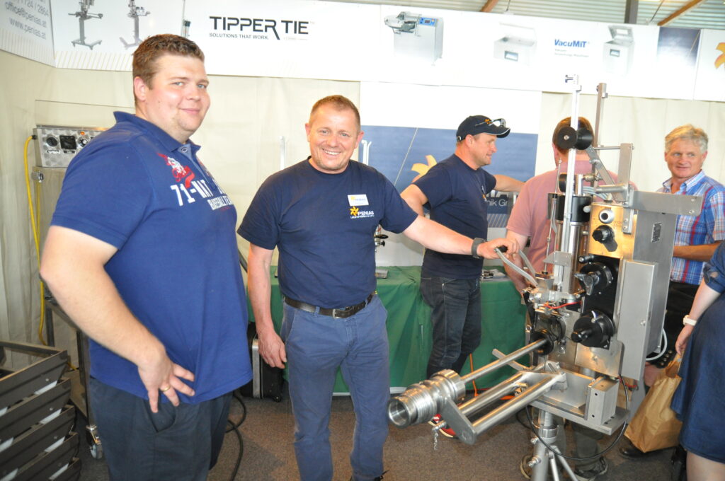 Der „Maschinenflüsterer“ im Einsatz: Johann Penias (r.) erklärt einem Interessenten einen Clipper von Tipper Tie. © Beigestellt