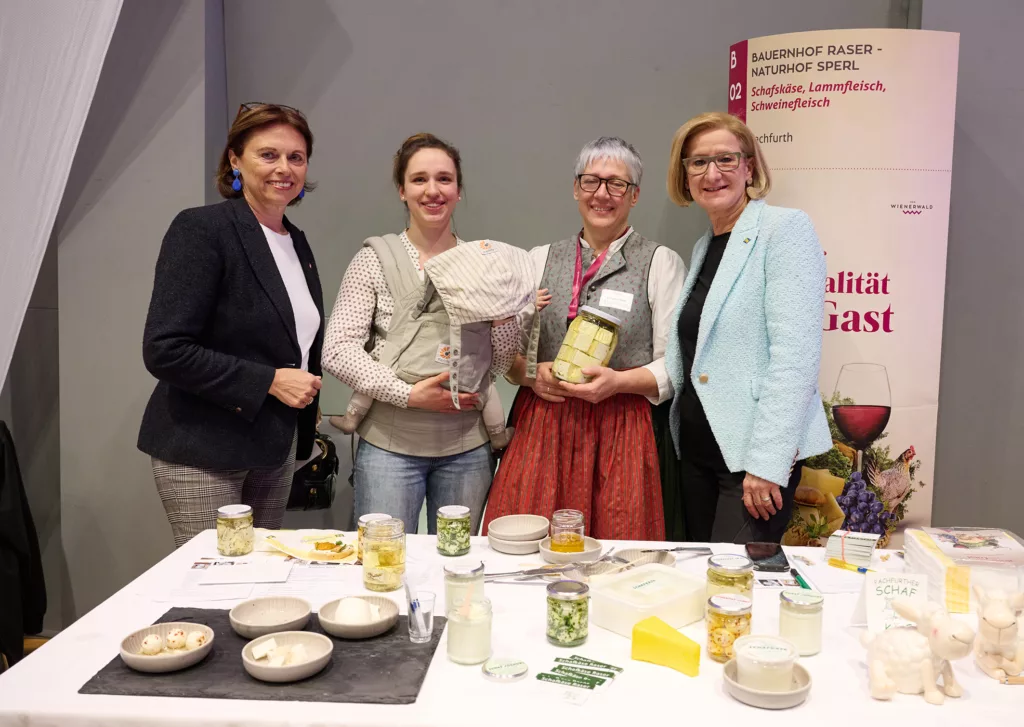 Staatssekretärin Susanne Kraus-Winkler (li.) und Landeshauptfrau Johanna Mikl-Leitner (re.) am Stand von „Schafkäse Raser” aus Pachfurth.