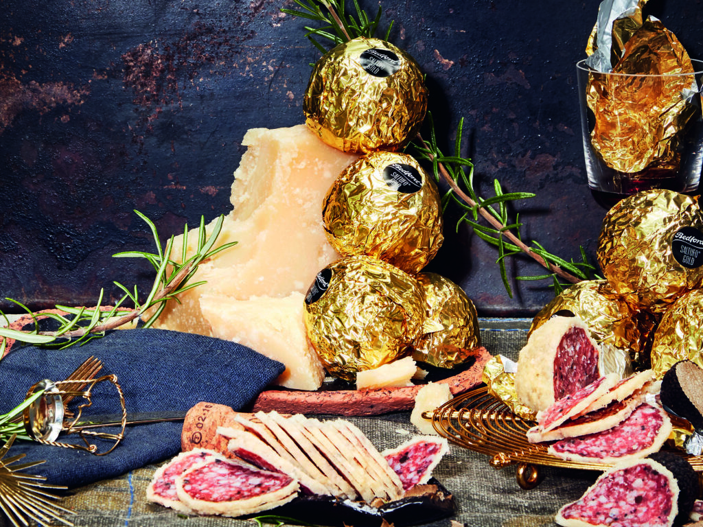 Die Deko passt perfekt zur edelgoldenen Verpackung der Salamikugel, die mit einer Kombination von Schweinefleisch und erlesenen Sommertrüffeln hergestellt und anschließend mit landestypischem, geraspeltem und 24 Monate gereiftem Parmigiano Reggiano umhüllt wird.