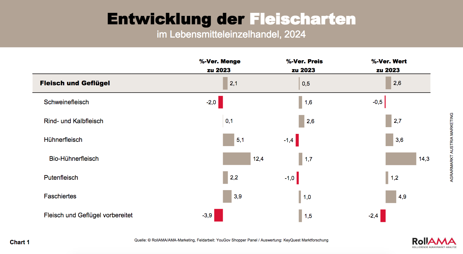 Der Trend ist langfristig: Lag der Anteil von Hühnerfleisch am gesamten Fleischkauf im Lebensmitteleinzelhandel 2004 noch bei rund 19 %, so waren es 2024 bereits 26 %. Auch Putenfleisch legte zu. Im Segment Geflügel entfällt der Großteil der gekauften Menge – rund 76 % – auf Huhn.