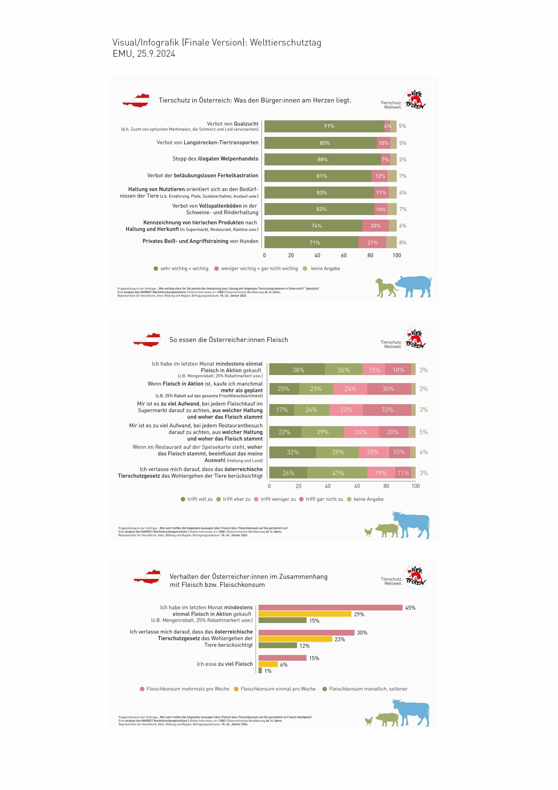 Die VIER PFOTEN-Studie fordert daher nicht nur eine klarere Kennzeichnung der Herkunft und Haltung von Tieren in der Gastronomie und im Handel, sondern auch ein Ende der Billigaktionen auf Fleisch. 74 Prozent der Befragten sprechen sich für eine verpflichtende Kennzeichnung tierischer Produkte nach Haltung und Herkunft aus, was verdeutlicht, dass die Konsument vermehrt Transparenz und Qualität verlangen. Die Studie macht deutlich, dass der bewusste Konsum von hochwertigem Fleisch, wie es handwerkliche Fleischer anbieten, ein wesentlicher Schritt in Richtung eines nachhaltigeren und verantwortungsvolleren Konsumverhaltens ist.