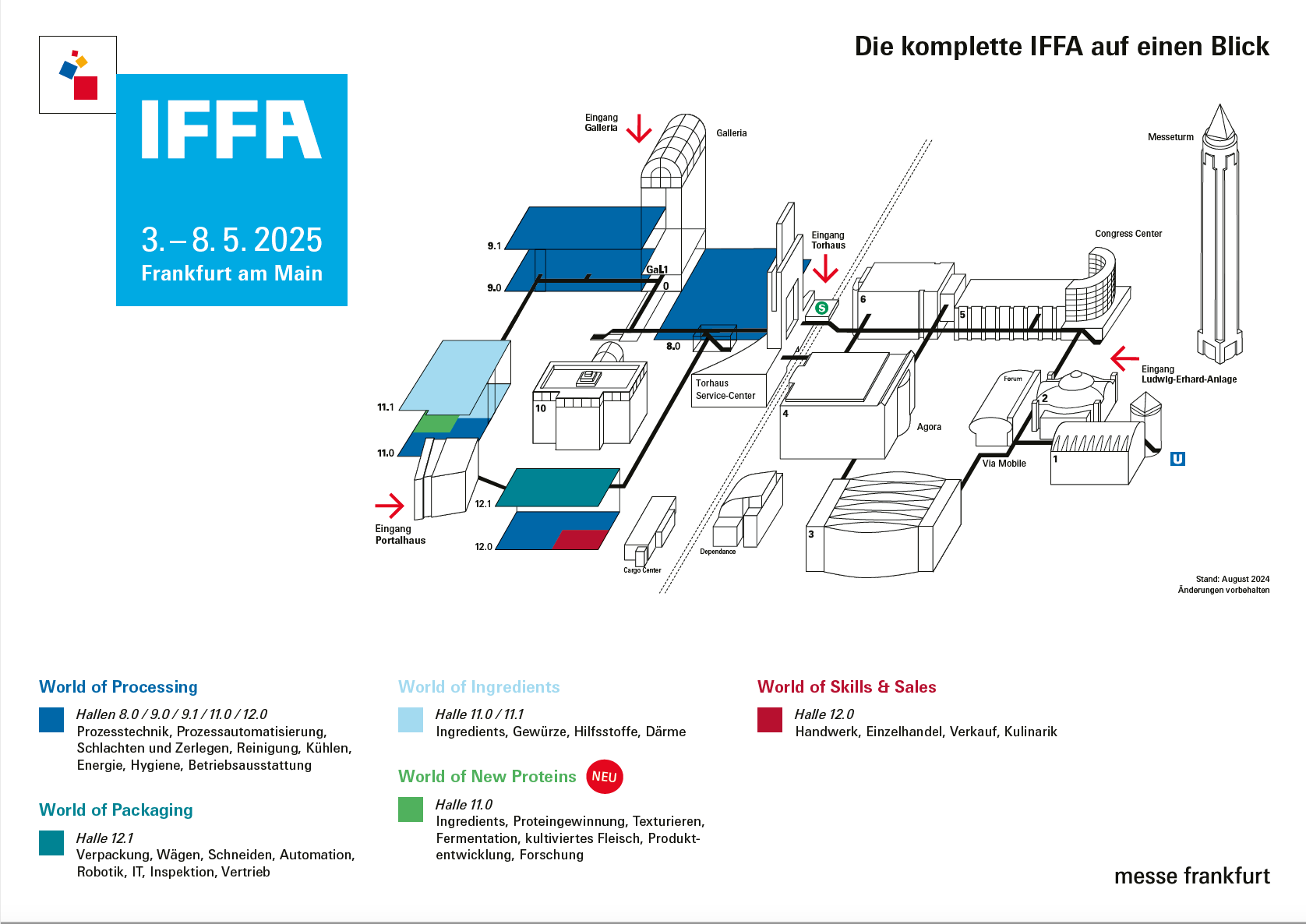 Die IFFA belegt die Hallen 8, 9, 11 und 12 und bietet mit der neuen Gliederung ein kompaktes Erlebnis. Alle Informationen sowie das Programm sind unter www.iffa.com abrufbar. Die IFFA 2025 in Frankfurt ist Pflichtprogramm für Österreichs Fleisch- und Proteinwirtschaft. Nutzen Sie die Chance, Teil dieses internationalen Branchentreffs zu sein und die Zukunft der Fleischwirtschaft aktiv mitzugestalten.