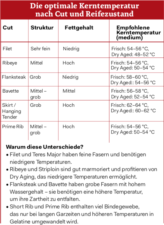 Ronny Paulusch: „Absolut. Besonders deutlich wird es bei grobfaserigen Cuts wie Skirt, Flank oder Hanging Tender. Diese Stücke bestehen aus großkalibrigen Muskelfasern und enthalten deutlich mehr intrafibrillären Fleischsa“ – was sie besonders sensibel für zu niedrige oder zu hohe Zieltemperaturen macht. Was bei klassischen Tabellen mit 56 Grad als medium gilt, liegt bei diesen Stücken realistisch eher bei 62 bis 64 Grad – je nach Reifung und Fütterung. Auch bei sehr feinfaserigen Cuts wie Filet oder Teres Major zeigt sich, dass schon eine Differenz von zwei bis vier Grad den entscheidenden Unterschied machen kann – nur eben in die andere Richtung.“