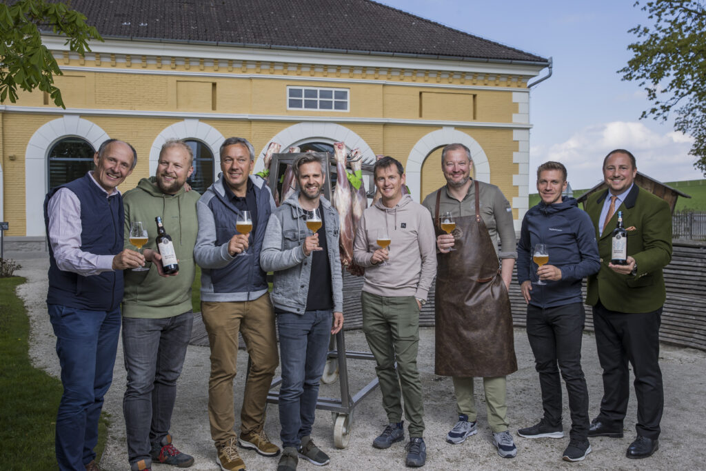 Ein Bier auf die Herkunft: die Spitzenköche und Rinderzüchter – Hannes Hönegger und Fritz Strobl – mit den „Koch.Campus“-Unterstützern von Stiegl und Salzburger Land-Tourismus in Wildshut.
