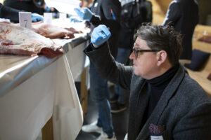 Die optische Bewertung der 9 Kälber ging der sensorischen Begutachtung voraus. Hier nimmt Fleisch & Co-Autor Roland Graf gerade das reinrassige (!) Wagyu-Kalb unter die Lupe. © Jörg Lehmann