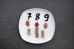 Mit 1.682 Punkten blieb das älteste Kalb, ein siebeneinhalb Monate in Holland gemästetes Tier (verpackte Schale aus dem Großmarkt), dagegen unter 2.000 Punkten und wurde klares Schlusslicht. Bereits am Teller hatten die blasse Farbe und das leicht säuerliche Tartar sich deutlich von den anderen Proben abgehoben. Wenig besser wurde das deutsche Kalb, das ebenfalls in den Niederlanden gemästet wurde, bewertet (1.967 Punkte). Gemeinsam mit dem konventionellen Pinzgauer Rind, das Milchaustauscher und Heu als Futter erhielt, bildete das in Deutschland geborene und geschlachtete „Schwarzbunt Holstein“ das letzte Drittel. Die Ehre des Pinzgauer Rinds rettete aber das in biologischer Fütterung aufgezogene Kalb vom Stiegl-Gut Wildshut – es erhielt die zweitbeste Bewertung (2.833 Punkte) im Geschmackstest. Überraschend war auch das Abschneiden des Wagyu-Kalbs, das sich nur wenig vor den klaren Schlusslichtern auf Platz fünf einreihte.