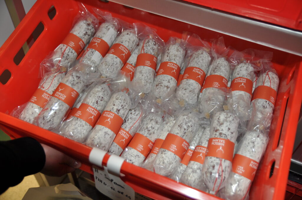 Der Vorteil des Konzepts liegt auf der Hand: eine Komplettvermarktung von Edelteilen, Menüs und Wurst- und Schinkenprodukten vom Wild. Dafür ging Hermann Hofmeister strategische Partnerschaften mit Wurstproduzenten ein. So etwa mit der Fleischerei Hiess in Asparn an der Zaya, die für Mei Jagarei die Wildsalami und die Wild-Pfefferpralinen herstellt. Den Rohschinken und die Rohwürstel fertigen die Kirchdorfer Fleischwaren in Kirchdorf an der Krems für Mei Jagarei. Mittlerweile umfasst das Wurst- und Schinkensortiment bereits mehr als zehn Produkte. Ebenso vielfältig ist das Angebot an Wildmenüs: Chili con Deer, Wildsugo, Wildgulasch, um nur einige der Köstlichkeiten zu nennen. Gefertigt werden die Köstlichkeiten von vier Mitarbeitern und Produktionsleiter Gerald Müller auf einer Fläche von rund 400 Quadratmetern.