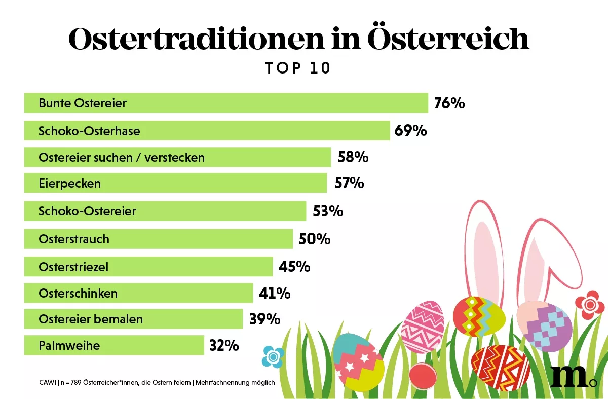 Neben kulinarischen Genüssen spielen auch das Schmücken mit bunten Eiern und die Freude am Schoko-Hasen eine große Rolle. Fast 60% der Befragten pflegen zudem die Tradition des Ostereierversteckens und -suchens sowie des Eierpeckens. Im Gegensatz dazu nehmen kirchliche Bräuche wie die Palmweihe oder der Oster-Gottesdienst eine geringere Rolle ein.