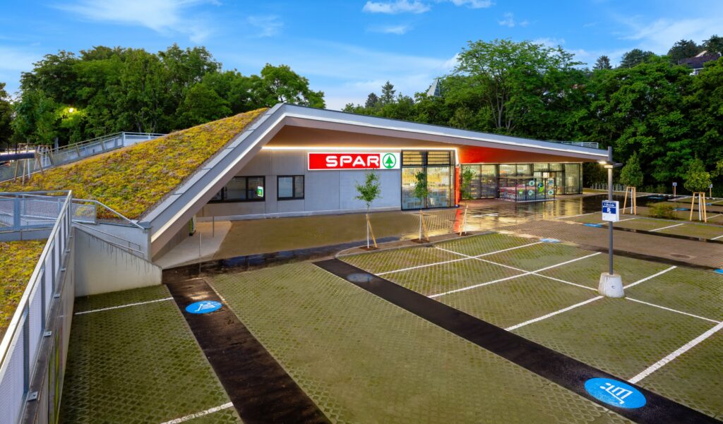 SPAR eröffnete am 22. Juni 2023 einen, im wahrsten Sinne des Wortes, „grünen“ Supermarkt im 14. Wiener Gemeindebezirk. Ein Gebäude, das sich in die Landschaft einfügt, ein wirklich grüner Parkplatz und alte Bäume um die herumgebaut wurde – das findet man im neuen SPAR-Supermarkt in der Hüttelbergstraße. Besser könnte sich ein Gebäude nicht in das Landschafts- und Vogelschutzgebiet am westlichen Stadtrand von Wien einfügen. Das ist Nahversorgung, die der Natur Raum gibt! Bereits der erste Blick auf den neuen SPAR-Supermarkt in der Hüttelbergstraße zeigt ein bunt bepflanztes Dach mit kleinen Biotopen – flach gebaut und schon fast eins mit der Umgebung. Auf dem Parkplatz sind nur die schmalen Gehwege für die Einkaufswagen asphaltiert – die insgesamt 37 Parkflächen und die Fahrbahn sind aus Rasengittersteinen. Bäume findet man nicht nur auf dem Parkplatz – im umliegenden Wald stehen echte Baumriesen. Für einen dieser wertvollen, alten Bäume wurde sogar auf einen Parkplatz verzichtet. „Wir haben uns bei der Planung an der Umgebung orientiert. Die Parkplatz-Begrünung mit Rasengittersteinen, Bäumen und Sträuchern kennt man von anderen Standorten – wirklich außergewöhnlich ist aber, wenn man die gesamte Dachfläche bepflanzt, ein Biotop am Dach schafft und um alte Bäume herumbaut,“ erklärt SPAR-Geschäftsführer Mag. Alois Huber.