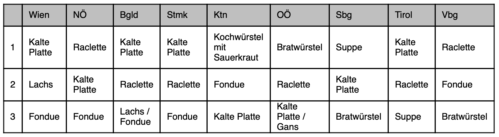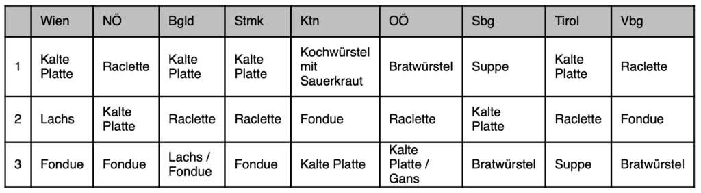In der gesamtösterreichischen Rangliste der Weihnachtsspeisen sind kalte Platten und Raclette mit jeweils 23 Prozent am beliebtesten. Bratwürstel, Fondue und Suppen folgen dicht dahinter. Lachs, Gans und Karpfen sind seltener auf österreichischen Weihnachtstischen zu finden, zeigen jedoch in bestimmten Regionen eine erhöhte Beliebtheit.