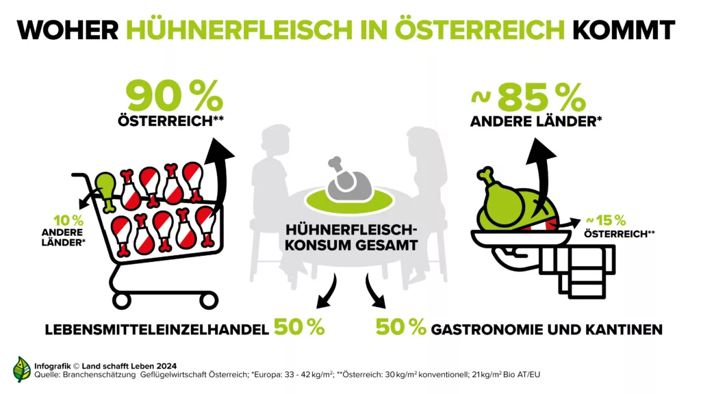 Während der Fleischkonsum in Österreich insgesamt abnimmt, wird Hühnerfleisch immer beliebter. Im Lebensmitteleinzelhandel handelt es sich bei geschätzt 90 Prozent des Hühnerfleisches um österreichisches Fleisch. Im Außer-Haus-Verzehr, also der Gastronomie und der Gemeinschaftsverpflegung, zeichnet sich ein anderes Bild. Hier kommen laut Schätzungen nur etwa 15 Prozent des Hühnerfleisches aus Österreich, beim Rest handelt es sich um Importware. Das liege unter anderem an einer mangelhaften Kennzeichnung, sagt Hannes Royer, Gründer des Vereins Land schafft Leben: