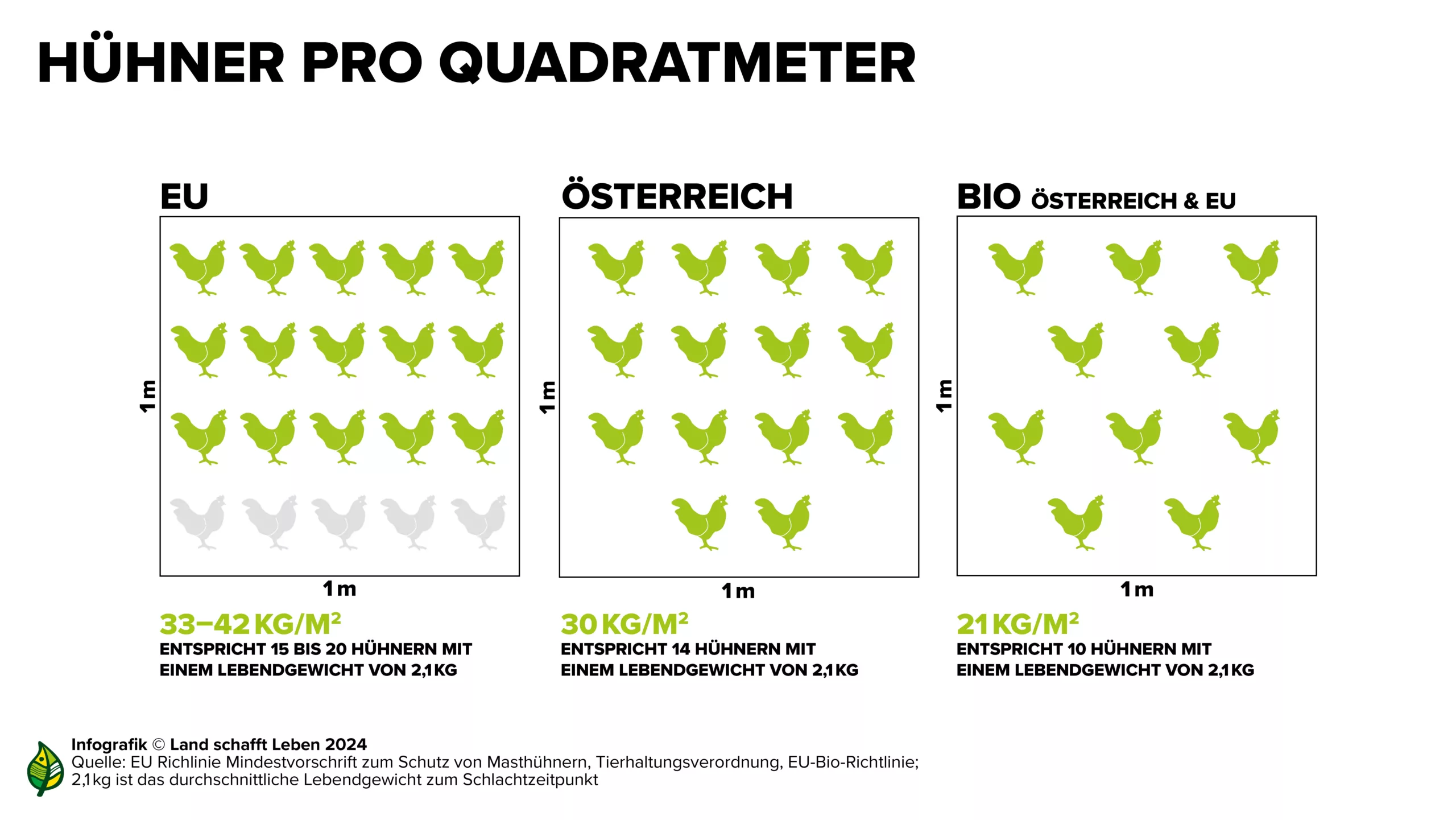 Dabei macht die Herkunft einen großen Unterschied. Zum Beispiel hinsichtlich der Haltungsbedingungen: In keinem anderen EU-Land haben Hühner in konventioneller Haltung so viel Platz wie in Österreich. Hierzulande dürfen laut Gesetz maximal 30 Kilogramm Hühner pro Quadratmeter stehen. Dies entspricht etwa 14 Hühnern. In unseren Nachbarländern stehen 15 bis 20 Hühner auf der gleichen Fläche. Auch die gentechnikfreie Fütterung und ein besonders strenges Kontrollwesen in Sachen Tiergesundheit unterscheiden die österreichische Hühnermast von jener in anderen Ländern. Hannes Royer dazu: