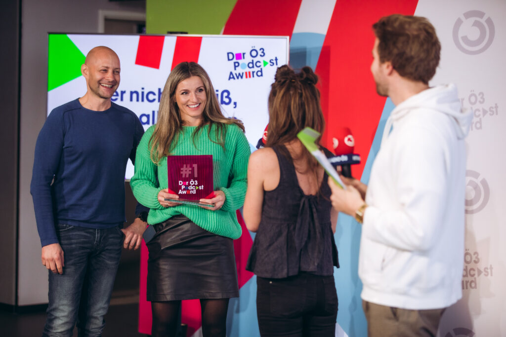 (v.l.) Podcast Award, Hannes Royer, Maria Fanninger, Christina Pausch, Paul Urban (© Hitradio Ö3/Mila Zytka)