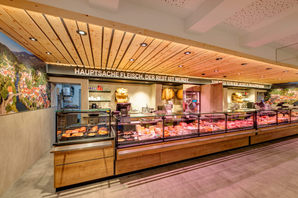 Fleischermeister Josef Kail versteht sein Handwerk – nicht nur mit Schneidemesser und Hackbeil, sondern auch in der Sprache. Das Fachgeschäft, das er mit seiner Frau Bianca seit 2019 in Murau betreibt, heißt „Die KAILerei“ und seit dem Umbau im November 2022 steht auf der Rückwand: „Hauptsache Fleisch, der Rest ist Wurst.“ Wurst, wer sich um den Umbau des in die Jahre gekommenen Ladens kümmern sollte, war es ihm aber nicht. Ernst Sommerauer, Landsmann aus der Steiermark und Vertriebsleiter von Aichinger sollte es sein. Die Herausforderung: Den Laden mit nur 40 Quadratmetern Fläche in nur 14 Tagen umzubauen und ein neues Raumerlebnis zu schaffen.