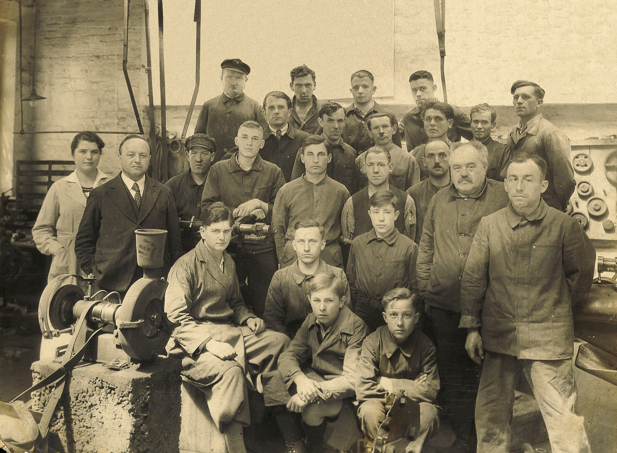 Die Handtmann- Belegschaft im Jahr 1936, links Karl Handtmann und seine älteste Tochter Carol, rechts mit Schnurrbart der Bruder Albert Handtmann. © Beigestellt