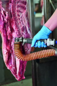 Für sichere Abläufe in der Schlachtung setzt der Fleischverarbeiter den Quantum Flex-TrimVac ein. Das Rundmesser wird in Kombination mit einer Vakuumanlage zur Entfernung von potenziell riskantem Rückenmarkgewebe oder innen liegendem Fett aus schwer zugänglichen Bereichen genutzt. Das geschlossene System saugt das Risikomaterial direkt ab und transportiert es zur Entsorgung. Das Werkzeug mit seiner besonders schnell rotierenden Klinge ermöglicht ein sehr präzises Arbeiten.