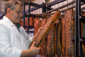 Von drei bis vier Wurstsorten und zwei verschiedenen Würsteln ist heute keine Rede mehr, rund 100 Produkte stellen die Knauers in ihrer Spezialitätenmanufaktur her. Das Rohmaterial dafür bezieht der Betrieb von Lieferanten in Salzburg und Oberösterreich, die passgenau das liefern, was die beiden Knauers zum Wursten und Speckproduzieren benötigen. Die Selbstschlachtung hat man 2016 eingestellt. Fritz Knauer sieht das ziemlich nüchtern: „Dank der Klassifizierung erhalte ich stets die Qualität, die ich benötige. Bei Schweinen ist das die Klasse E1, also Tiere mit ordentlichem Speck, eingewachsenem Fett und kompaktem Fleisch.“