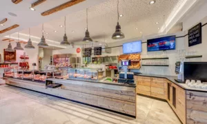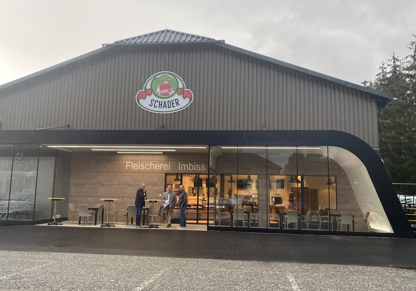 Um den urigen Eindruck des Gebäudes im Ladenkonzept mit aufzunehmen, setzten die Einrichte-Profis ganz auf warme Holztöne. Die perfekt abgestimmte Ladenbeleuchtung generiert einen einzigartigen Wohlfühl-Charakter. Der großzügige Einsatz von Spiegeln lässt das Geschäft deutlich größer, wärmer, freundlicher und nochmals heller wirken. Absolutes Highlight des neuen Geschäfts ist aber ein hölzernes Wasserrad, das als zusätzliches Warenpräsentationsdetail perfekt integriert wurde. Der Komplettumbau hat der Fleischerei Schader sichtlich gutgetan und den rund 100 Quadratmeter großen Laden zu einer kulinarischen Wohlfühloase gemacht, die wirklich zum Verweilen verführt. Das gleiche Konzept verfolgte man 2020 bei der Filiale, die in den neu errichteten Produktionsbetrieb eingebettet wurde. Wiederum entschieden sich die Schaders für Aichinger als bereits bewährten Ladenbaupartner. Wiederum sind es die warmen Holztöne, die dominieren, allerdings in einer wesentlich helleren Umgebung, bedingt durch die reine Glasfassade.