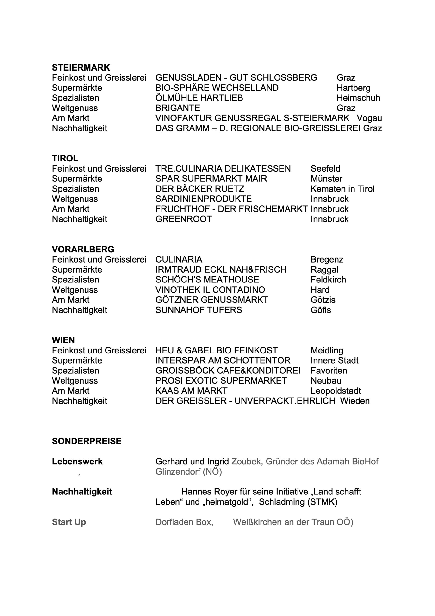 Demnach ist jedes im Guide angeführte Geschäft ein besonderes. Pro Bundesland werden überdies die besten Betriebe in den fünf Hauptkategorien – Feinkost und Greisslerei, Supermarkt, Spezialisten, Weltgenuss und Am Markt – für ihren außergewöhnlichen Einsatz, mit dem Genuss Guide Award ausgezeichnet. Ebenso wird das jeweils beste Geschäft zum heurigen Schwerpunktthema Nachhaltigkeit geehrt.
