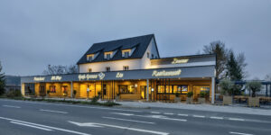 Drei Jahre später hatte er es: „Ja, jetzt passt’s!“ Ein nahezu 45 Meter langes Gebäudeensemble mit weit sichtbarer Leuchtschrift an der B54 zwischen Graz und Wien, 58 Parkplätze vor, hinter und unter dem Gebäude. Gegenüber liegt ein zentraler Busknotenpunkmit vier Haltestellen, und auch der Fernradweg führt direkt an seinem Grundstück vorbei.