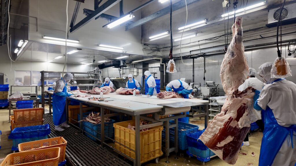Am vierten Tag meiner Reise ging es mit dem Mietwagen von Tokio in die Präfektur Gunma, um die Toriyama Cattle Farm zu besuchen. Heimat des berühmten „Umami Wagyu“. Der Besitzer, Wataru Toriyama, verfolgt hier einen konsequenten Ansatz, bei dem die Tiergesundheit von klein auf an erster Stelle steht. Er praktiziert dabei eine konventionelle Haltung und setzt auf eine spezielle Fütterung mit Gras, Reisstroh (teils siliert) und pulverisiertem Miso (fermentierte Sojabohnen). Zusätzlich erhalten die Ochsen Mais und Getreide. Ich hatte die Gelegenheit, jeden Aspekt der Farm zu erkunden, angefangen von der Kälberstation bis zum Ochsenstall. Aktuell werden über 400 Mutterkühe auf der Farm gehalten. Nach der Besichtigung konnte ich die Qualität des Fleisches direkt beim Yakiniku-Lunch erleben. Der Genuss dieser hochwertigen Spezialitäten bestätigte die hervorragende Aufzucht und Fütterung der Tiere. Am Nachmittag durfte ich im laufenden Betrieb sowohl die Zerlegung als auch den Reiferaum anschauen und interessante Gespräche mit den Verantwortlichen über die japanische Herangehensweise führen. Ich war beeindruckt von der Präzision und Sorgfalt, mit der bei Toriyama Wagyu gearbeitet wird. Jedes Teilstück wird mit höchster Genauigkeit behandelt, da es bei der Verarbeitung um jedes Gramm Fleisch geht. Handwerkskunst und Fachwissen pur!