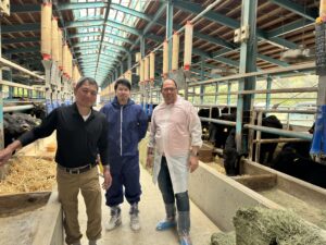über einen der größten traditionellen Betriebe mit 3.400 Tajima-Rindern teilnahm. Der Betrieb praktiziert konventionelle Haltung mit einem Fokus auf Mutterkuhhaltung. Ich wurde herzlich empfangen und erhielt die seltene Gelegenheit, tief hinter die Kulissen zu blicken. Dabei lernte ich die Praktiken der natürlichen Kälberaufzucht und der künstlichen Befruchtung kennen, während ich über das gesamte Betriebsgelände geführt wurde und alle Fragen beantwortet wurden. Dieser Besuch war für mich persönlich ein Gamechanger und beeinflusste meine Sicht auf Kobe-Beef maßgeblich.