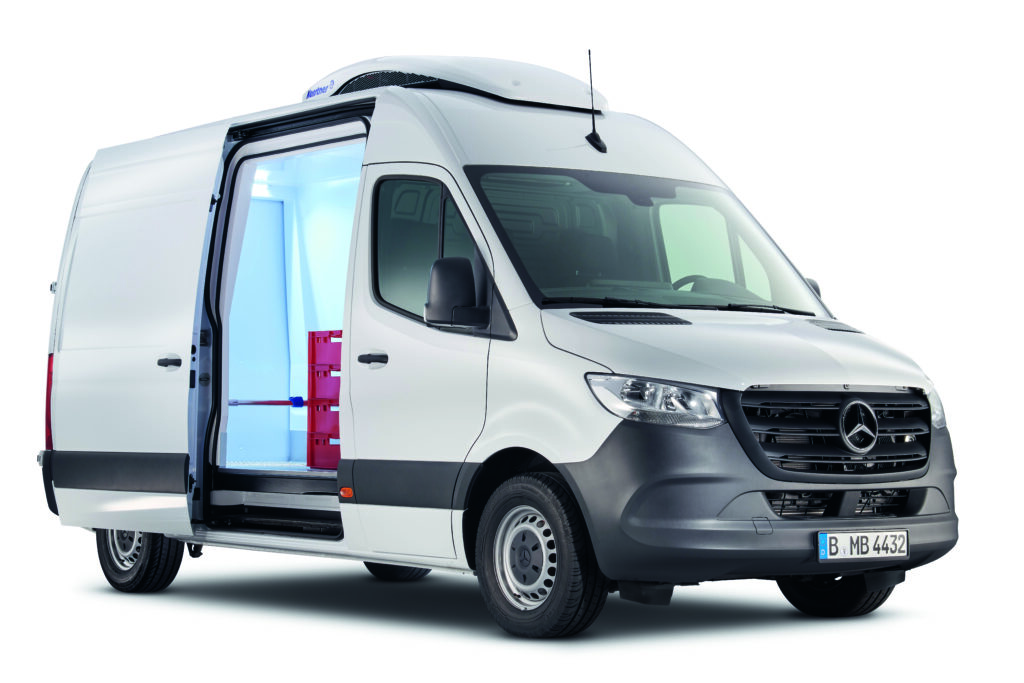 Mercedes-Benz VanSolution bietet zwei clevere Kühlausbauten für den Frischdienst-Einsatz. Der Sprinter mit Kühlausbau von Winter Kühlfahrzeugen glänzt mit einer unterflurmontierten Kühlanlage und verzichtet auf einen zusätzlichen Dachaufbau. Das macht ihn besonders aerodynamisch und spart Kraftstoff. Durch die direkt betriebene Kühlmaschine in Kombination mit dem Motorabtrieb vorn steht eine leistungsstarke Kühlung bis zu 0 Grad zur Verfügung.