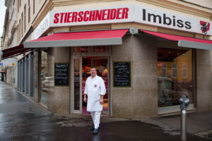Zwischen Dry Aged Beef und Bio-Huhn stehen Sigrun und Horst Stierschneider in ihrem Geschäft in der Wiener Märzstraße. Soeben hat sich ein Revierinspektor verabschiedet, eine Studentin löffelt genussvoll den Mittagstisch – Matrosenfleisch mit Spiralen – und ein Beinschinken-Semmerl mit Kren wird gemacht. Business as usual in Rudolfsheim-Fünfhaus! Nahezu unvorstellbar sind daher die Anfänge anno 1956, von denen Horst Stierschneider noch zu erzählen weiß. „Vom Gürtel weg haben sie die Tiere zum Großvater getrieben. Geschlachtet wurde im Hof, verarbeitet hat er sie in einem Kellerlokal.“ Heute alles unvorstellbar! „Was glaubst, was los wär‘, wenn uns dabei ein Stierl auskäme“, lässt der 56-Jährige seinen Humor durchblitzen. Selbst schlachtet er daher auch längst nicht mehr hinter Stadthalle und Lugner-City.
