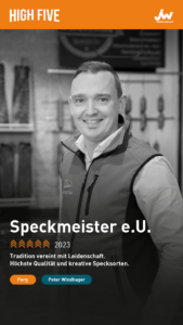 Immer wieder neue Kreationen und eine umfangreiche Auswahl unterschiedlicher Specksorten werden heute beim Speckmeister geschaffen. Und eine weitere Besonderheit ist die hauseigene, überlieferte Räucherei. Dieses Unikat wird täglich, und das ganz traditionell, mit der Hand beheizt. Und der ererbte Betrieb ist und heißt nicht einfach nur „Speckmeister”, sondern erhielt in den vergangenen Jahren mehr als 40 erfeuliche Auszeichnungen. Darunter ganze vier Mal den begehrten Titel „Speckkaiser”. Und zu guter Letzt kam nun auch noch der moderne „High-Five”-Preis dazu. Wir gratulieren!