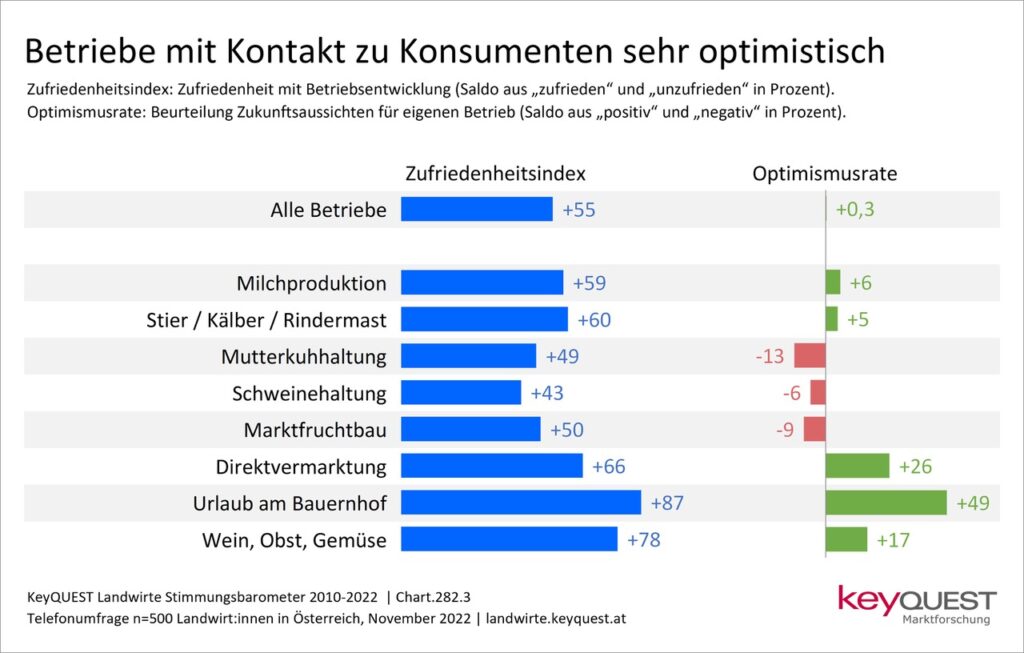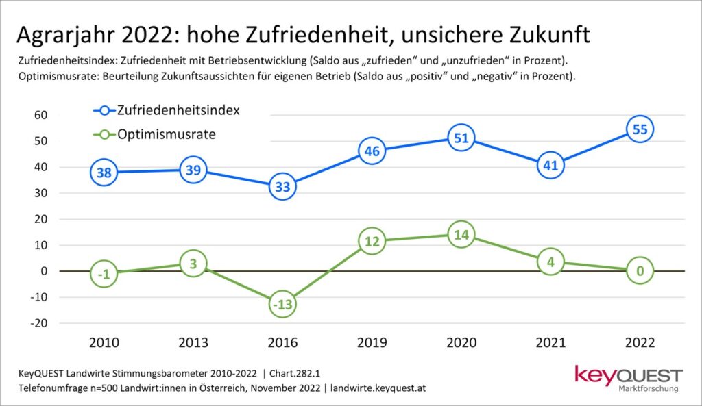 Im Rahmen der Landwirte-Mehrthemenumfrage von „keyQUEST“ wird regelmäßig die Stimmung unter den österreichischen Betriebsführerinnen und Betriebsführern erhoben. Die aktuellen Daten stammen von einer Telefonumfrage von Anfang November 2022 unter 500 Landwirtinnen und Landwirten.