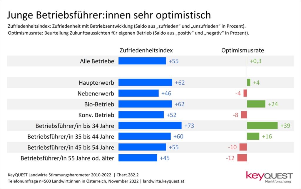 (Wien, 16. Dezember 2022) Laut dem aktuellen „Landwirte Stimmungsbarometer“ des Marktforschungsinstituts „keyQUEST“ blicken vor allem junge Bäuerinnen und Bauern unter 35 Jahren mit einem Saldo von plus 73 derzeit positiv in die Zukunft.
