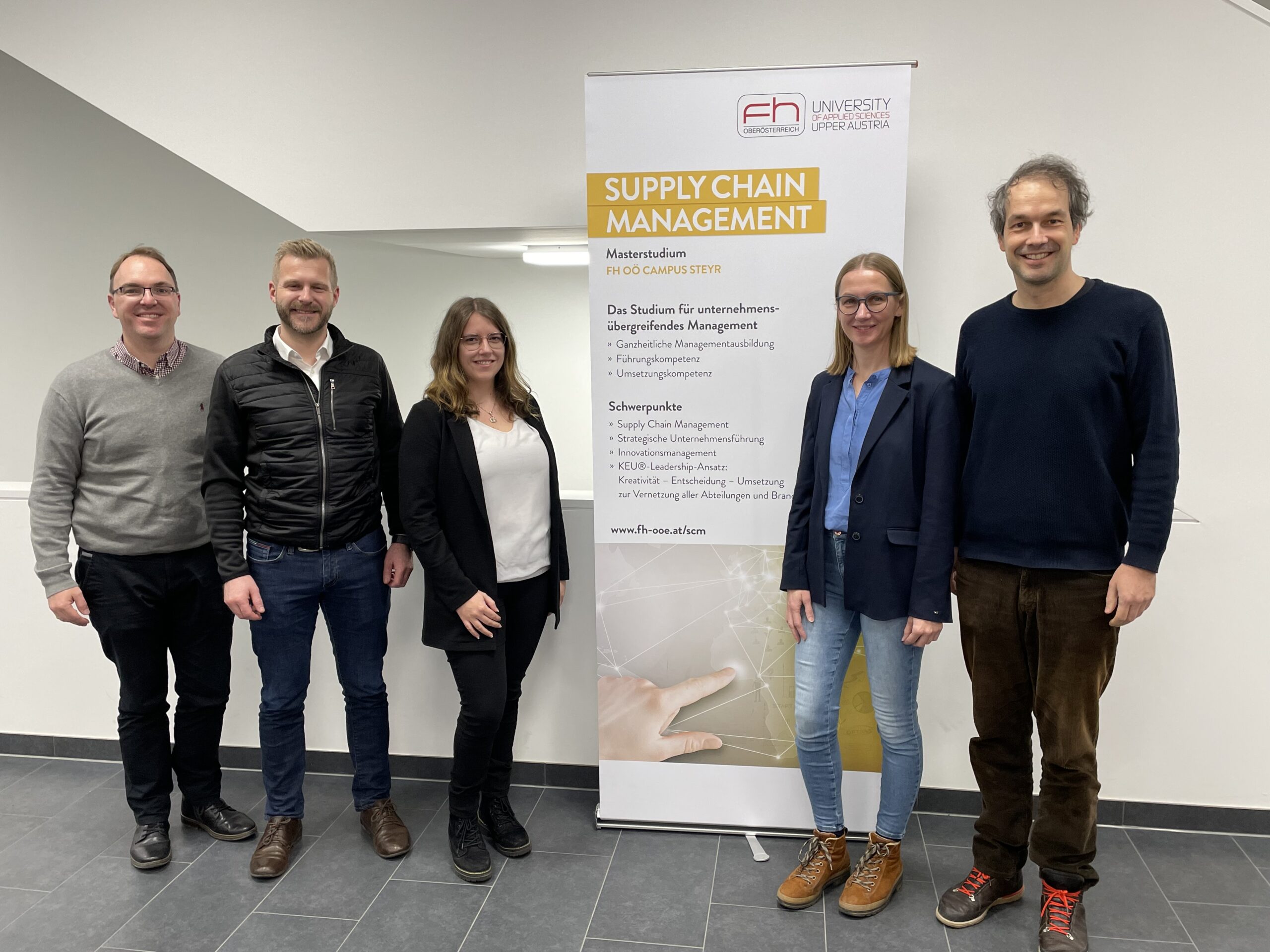 Das Team: : (v.l.n.r.): Michael Schedlbauer (Vice President Business Development Grocery bei TGW Logistics), Gerhard Hetzmannseder (Director Products & Engineering bei Hauser), Dr.in Marike Kellermayr-Scheucher, Natalie Bäuchler und Dr. Michael Plasch (FH-Assistenzprof. & Senior Researcher) © beigestellt von TGW Logistics