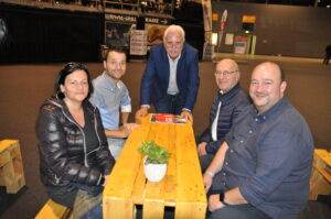 Der Bundesinnungsmeister mit Besuchern aus dem Burgenland (v. l.): Marlies Kieslinger, Lebensgefährtin von Fleischermeister Markus Loschy, Rudolf Tallian jun., Fleischerchef Raimund Plautz, Rudolf Tallian sen. und Fleischermeister Markus Loschy aus Großpetersdorf. © HaRo