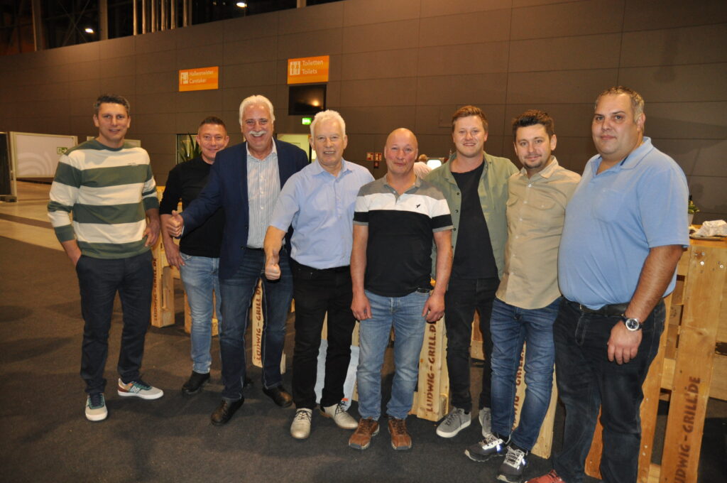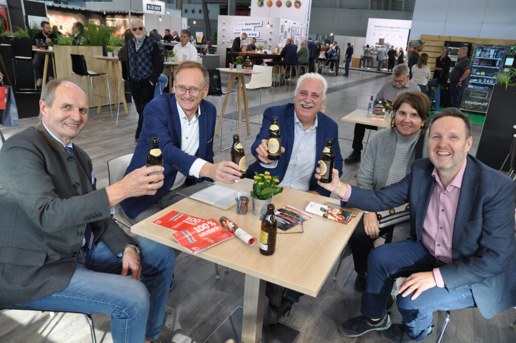 Salzburger-Treffen auf der SÜFFA (v. l.): Fleischerverbands-Obmann und Fleischermeister Anton Karl, Sohn Anton Nikolaus Karl, Schwiegersohn und Nachfolger Thomas Gassner sowie Gramiller-Verkaufsleiter Christian Hofer.© HaRo mehr anzeigen Fleischermeister Johann Christoph Gantner und ein Mitarbeiter aus Hollabrunn, Bundesinnungsmeister Raimund Plautz, der Baden-Württembergische Innungsmeister Joachim Lederer, die Fleischermeister Erich Sturm aus Großnondorf, Johann Schreiber