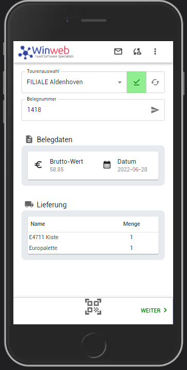 Mit der neuen Leergut-App kann der Fahrer, der beispielsweise E2-Kisten abgibt, den Lieferschein per Handy scannen und der entsprechende Beleg öffnet sich. Sehr bequem können hier die Kisten als „geliefert“ markiert und die Lieferung vom Kunden auf der App unterschrieben werden. Zurückgenommenes Leergut wird im Gegenzug ebenfalls in der App ausgewählt und im System vermerkt. Nach der Tour werden die Daten automatisch in winweb-food übernommen und die in der App niedergeschriebene Unterschrift im System an den Beleg angehängt. „Lieferscheine aus Papier, die nach der Fahrt noch manuell eingescannt werden müssen, werden auf diese Weise überflüssig“, erklärt Schummers.