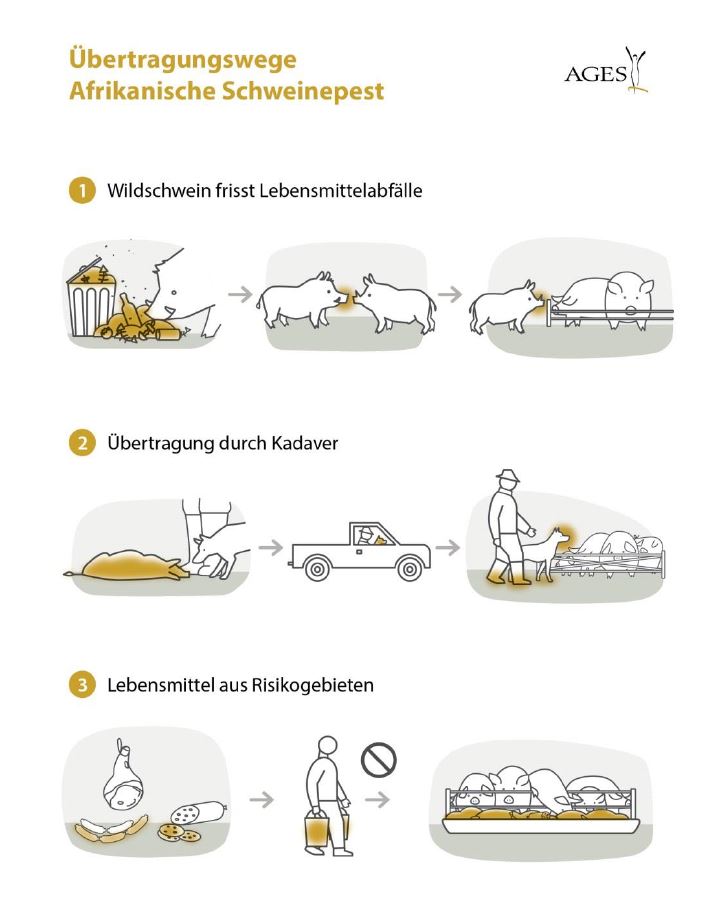 Die Afrikanische Schweinepest wird vor allem durch infizierte Schweine und das Verfüttern kontaminierter Speiseabfälle übertragen. Das Virus kann aber auch über kontaminierte Fahrzeuge, Ausrüstung oder Kleidung weiterverbreitet werden. Diese, von Menschen ermöglichten Übertragungswege stellen leider die häufigste Ursache dar, wenn ASP Fälle weit entfernt von infizierten Wildschweinpopulationen auftreten. Sehr häufig steht im Verdacht, dass sich Wildscheine über nicht ordnungsgemäß entsorgte Essensreste infiziert haben.