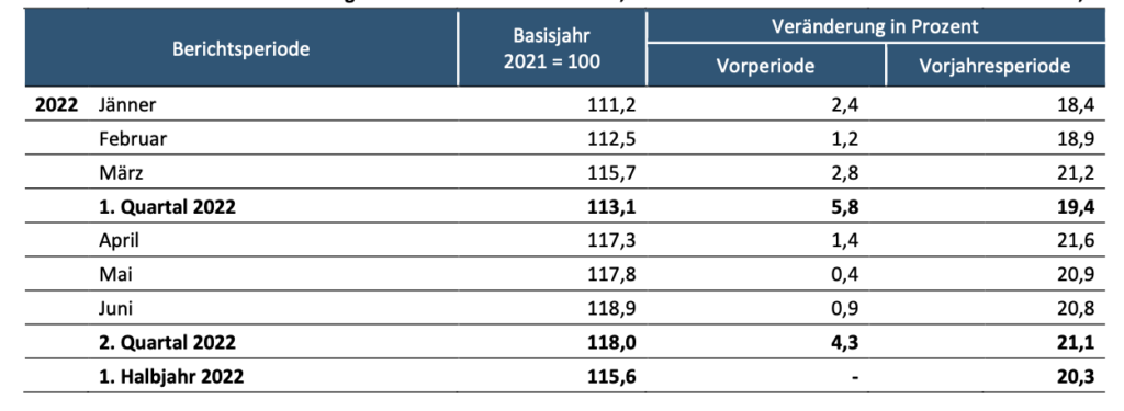 Für die steigende Indexentwicklung im Jahr 2022 (+19,4 %) waren hauptsächlich die starken Preisanstiege im Bereich Energie (+49,1 %) verantwortlich. Im Vorjahr 2021 wurde für Energie noch ein durchschnittlicher Preisanstieg um 16,6 % beobachtet. Speziell die Teuerungen bei industriell erzeugten Gasen, Dienstleistungen der Gasversorgung (+51,4 %), elektrischem Strom und Dienstleistungen der Elektrizitätsversorgung (+49,2 %) sowie bei Mineralölerzeugnissen ließen den Index für Energie im Jahr 2022 ansteigen.