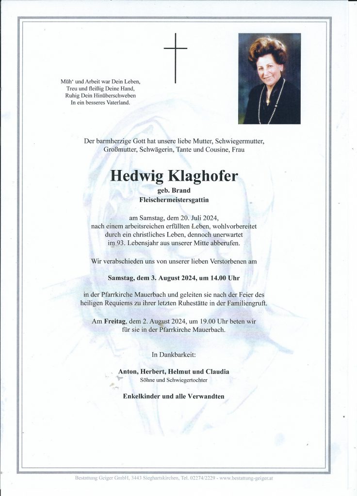 Hedwig Klaghofer wurde am 3. März 1932 in Baumgarten im Tullnerfeld als Hedwig Brand in eine Familie mit fünf Geschwistern geboren. 1953 lernte sie im Zuge eines Praktikums bei einem Wiener Fleischer ihren späteren Ehemann, den Fleischermeister Anton Klaghofer sen. aus Elsbach kennen und lieben.