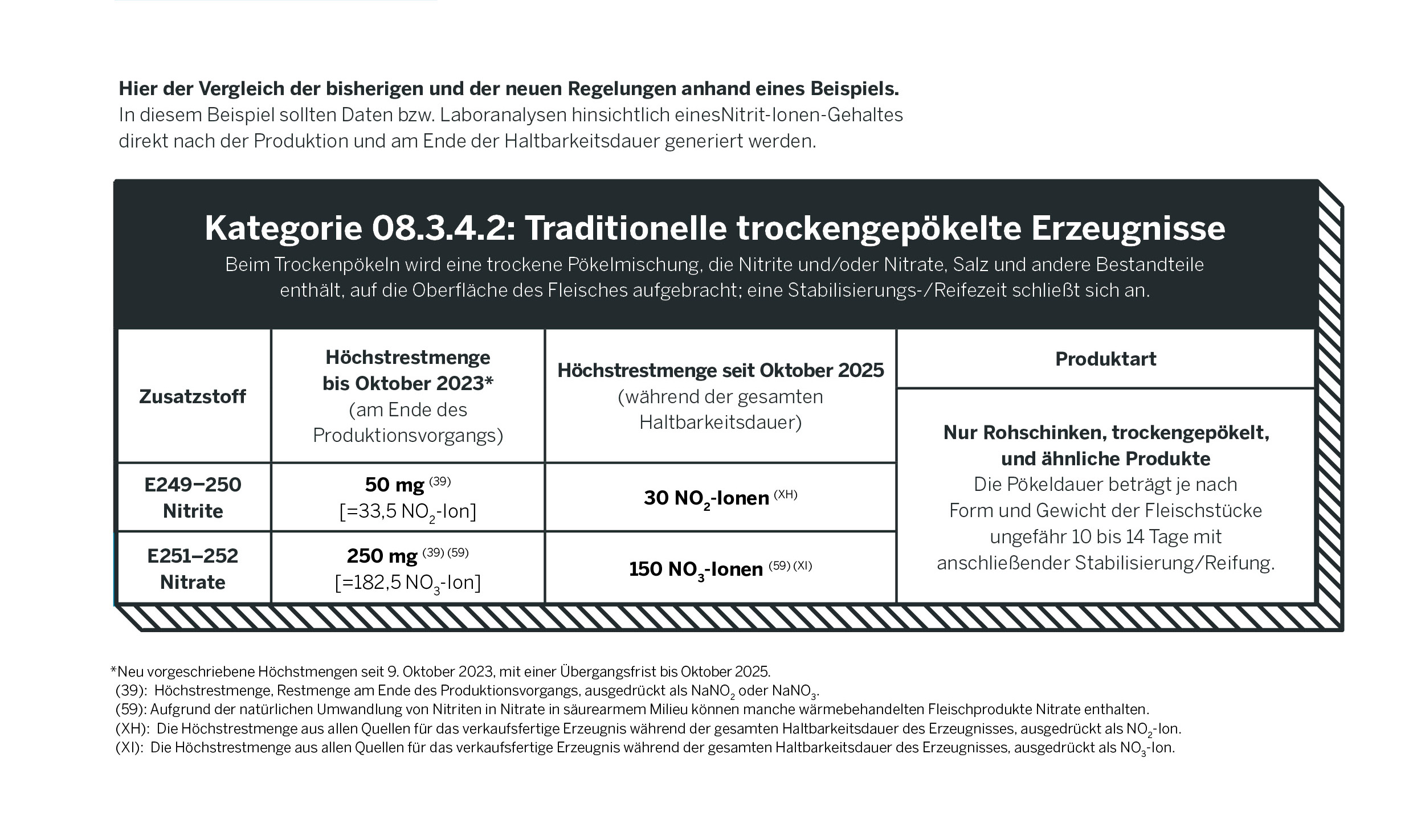 Neu vorgeschriebene Höchstmengen seit 9. Oktober 2023, mit Übergangsfrist bis Oktober 2025. (39) Höchstrestmenge – Restmenge am Ende des Produktionsvorgangs, ausgedrückt in NaNO₂ oder NaNO₃. (59) Aufgrund der natürlichen Umwandlung von Nitriten in Nitraten in säurearmem Milieu können manche wärmebehandelten Fleischprodukte Nitrate enthalten. (XH) Höchstrestmenge aus allen Quellen für das verkaufsfertige Erzeugnis während der gesamten Haltbarkeitsdauer, ausgedrückt als NO₂-Ion. (XI) Höchstrestmenge aus allen Quellen für das verkaufsfertige Erzeugnis während der gesamten Haltbarkeitsdauer, ausgedrückt als NO₃-Ion.
