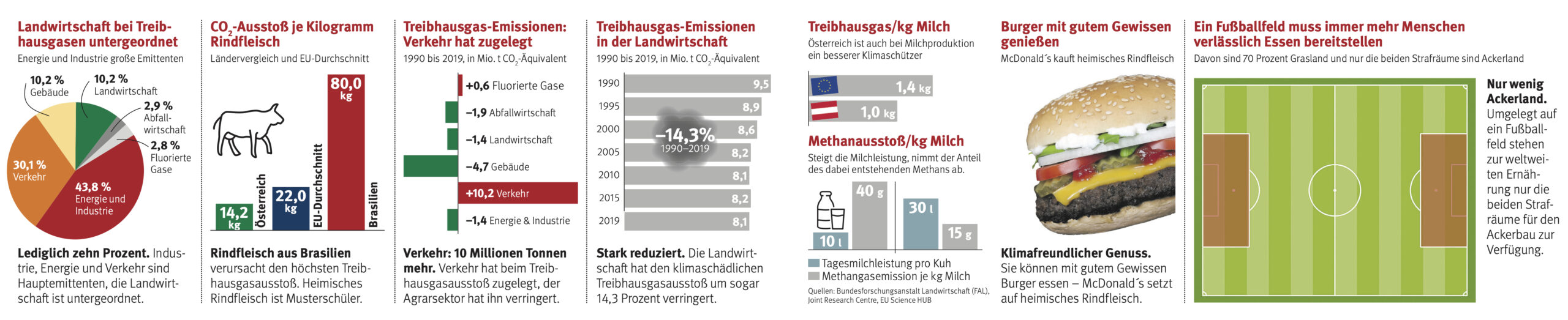 Ein EU-Durchschnittsrind erzeugt um 55 Prozent mehr Treibhausgase als ein österreichisches Rind. Während ein Rind im EU-Durchschnitt bei der Produktion von einem Kilogramm Rindfleisch 22 Kilogramm Treibhaus- gas ausstößt, verursacht ein österreichisches Rind nur 14,2 Kilogramm Treibhausgas je Kilogramm Rindfleisch. Ein brasilianisches Rind verursacht mit 80 Kilogramm gar 5,6-mal so viele Treibhausgasemissionen je Kilogramm Rindfleisch wie ein österreichisches Rind.