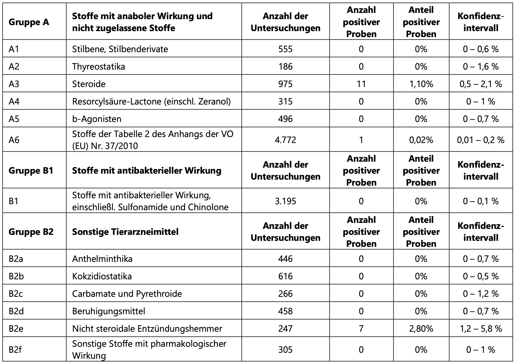Bei der Untersuchung der Planproben auf Stoffe der Gruppe A wie Stilbene und Stilbenderivate (A1), Thyreostatika (A2), Resorcylsäure-Lactone (einschl. Zeranol) (A4) und β-Agonisten (A5) wurden keine positiven Befunde ermittelt.